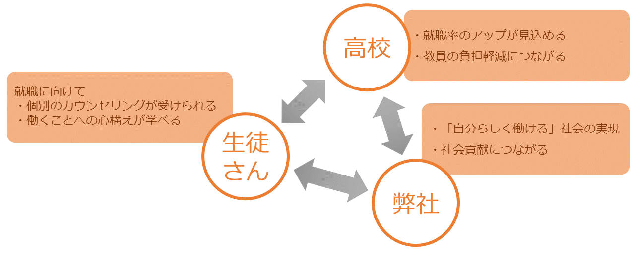 通信制高校が抱える「卒業後の就職サポートに対応しきれない」という課題に対して解決策を提供し、一方では「就職」というものがよくわからない高校生に、「働くこと」の理解を促進します。「人がイキイキと働く社会の実現」を目指す当社を含めて、高校・生徒さんとの三方よしの就職サポートを行っています。