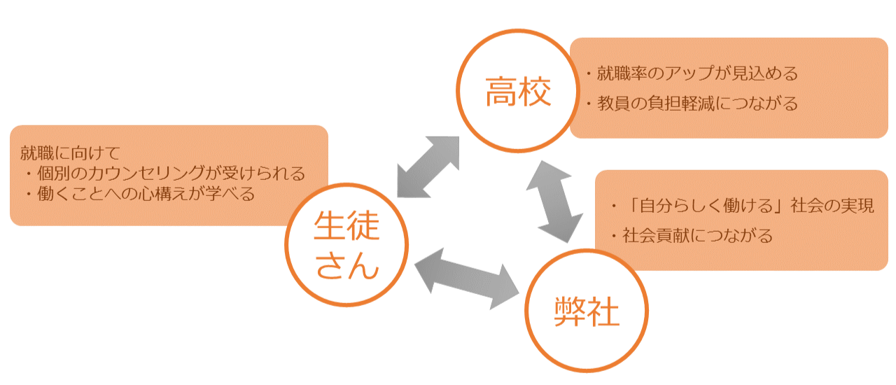 通信制高校が抱える「卒業後の就職サポートに対応しきれない」という課題に対して解決策を提供し、一方では「就職」というものがよくわからない高校生に、「働くこと」の理解を促進します。「人がイキイキと働く社会の実現」を目指す当社を含めて、高校・生徒さんとの三方よしの就職サポートを行っています。